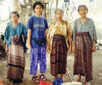traditionellen Sarongs der Frauen auf, die zusammen mit westlichen Blusen getragen werden.Seltener allerdings trifft man auf Männer, die noch die schwarz-blau gestreiften, langen Röcke tragen.Hier sehen Sie